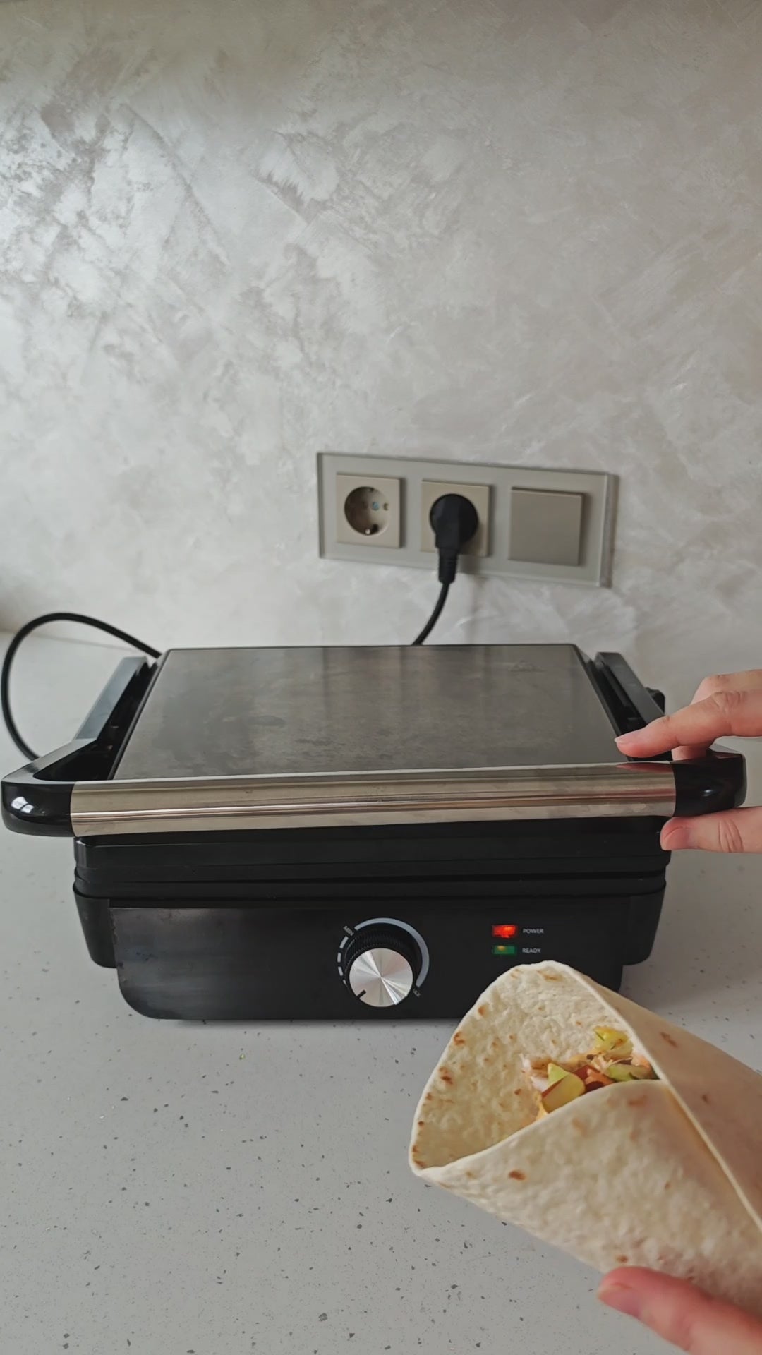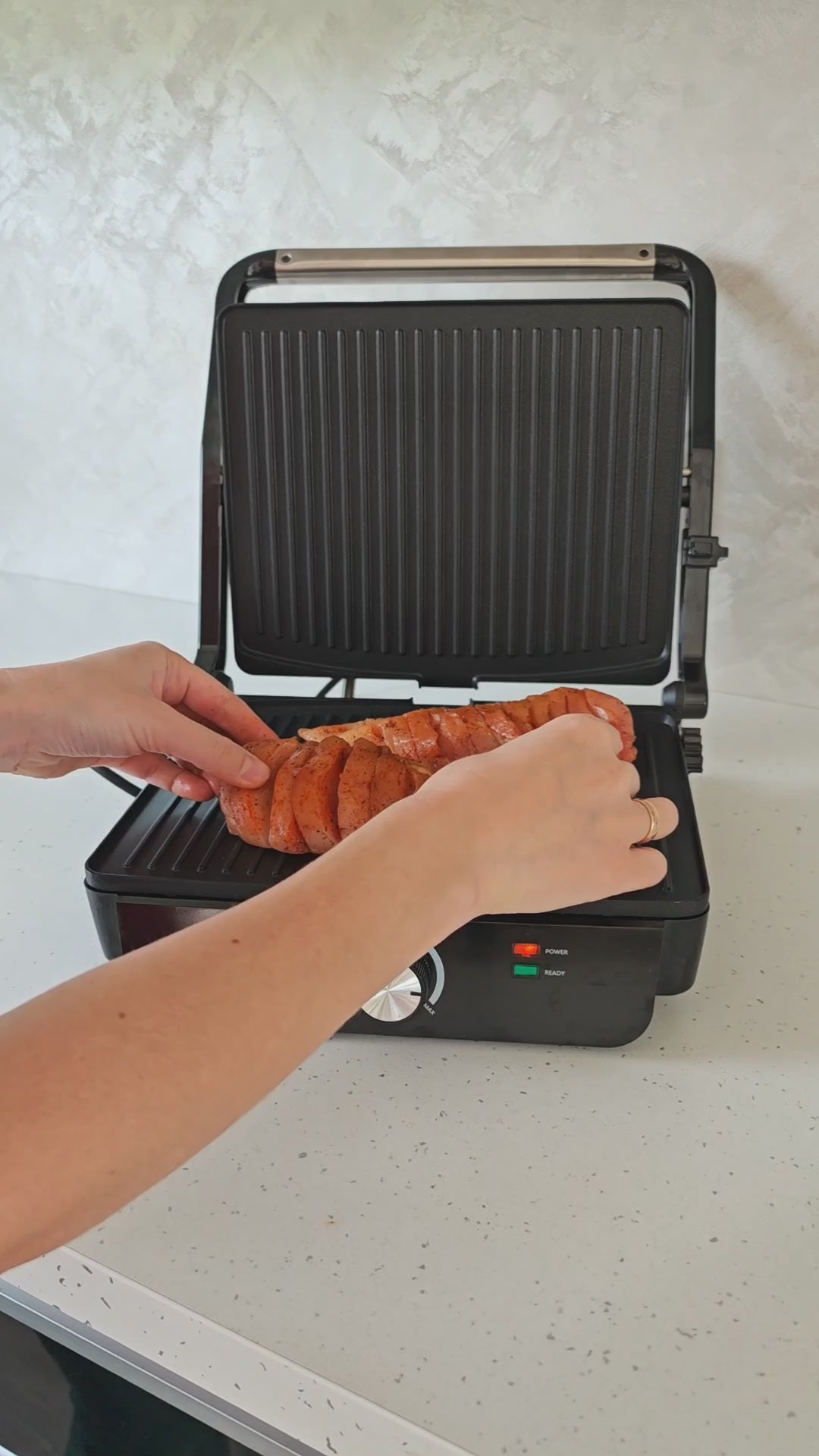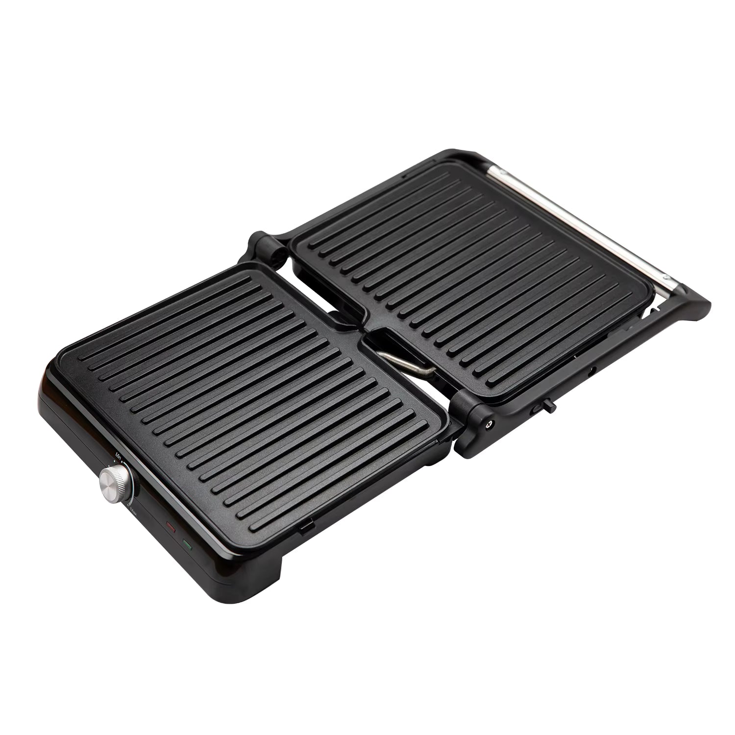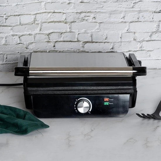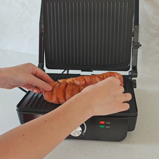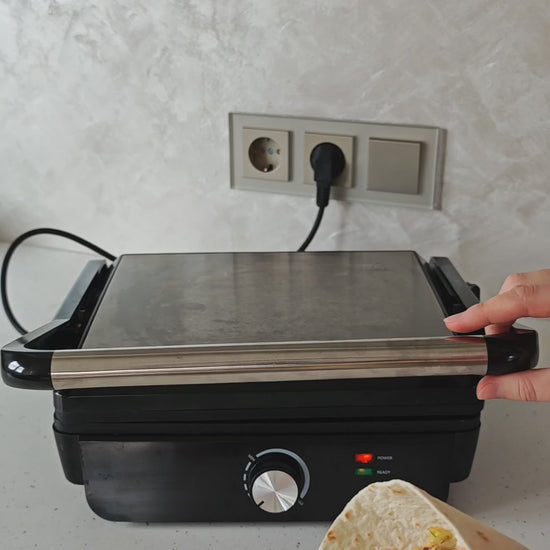 - Šį įrenginį vos per kelias sekundes galima paversti iš uždaro į atvirą 180 ° ir kepimo plotas padvigubėja. Ant atviro grilio labai patogu kepti įvairias daržoves ar jūros gėrybes bei mažus kepsnelius.